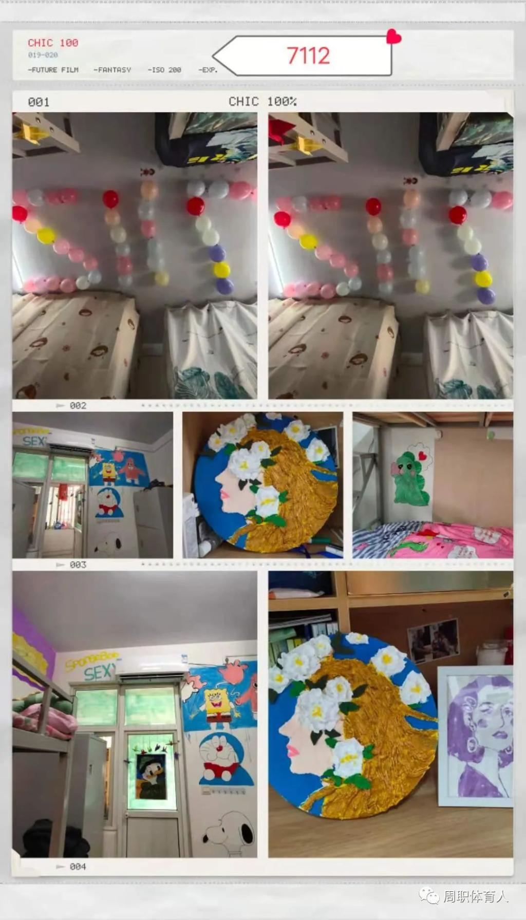 ·各个宿舍的同学根据自己的想法装扮自己的宿舍,包括门窗,墙壁,衣柜表面等,装扮时间为一周
