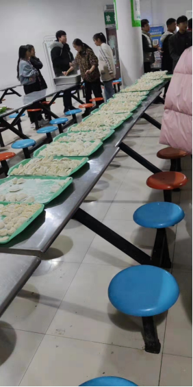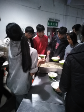 在活动过程中全体同学围在一起包饺子,尽管气温很低,包饺子的材料很冰,手很冷,但是同学们还是克服重重阻碍,乐在其中。